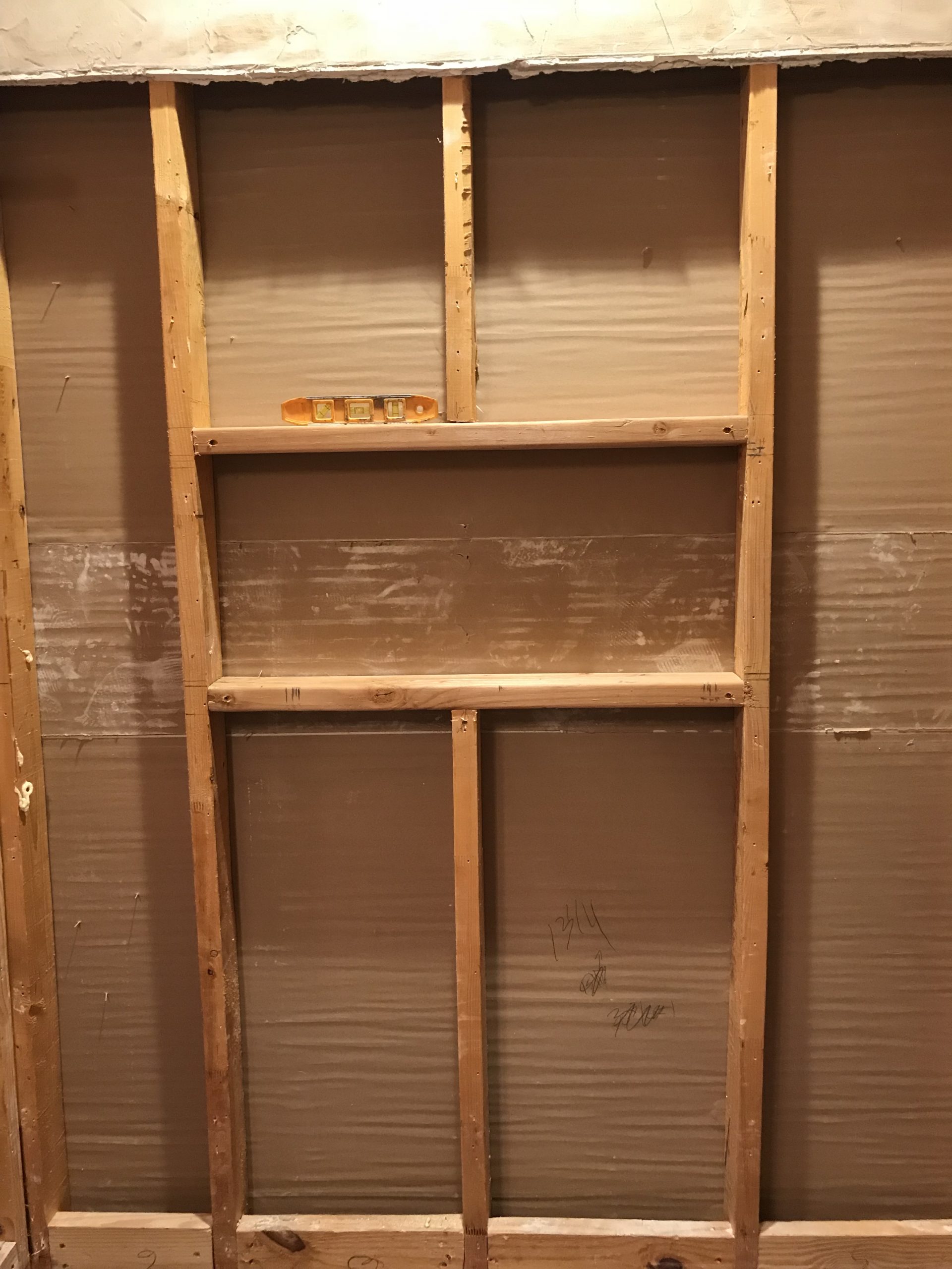 To frame in the new shower, we’ll need to add boards at the open end of the alcove that will form the structure of the tiled curb which will have a shower pan liner wrapped around it. One of the most popular additions to a current shower is a shampoo niche. These convenient little cubbies allow for neat storage of your showering products. We’ll insert boards between the wall framing studs to create a niche or niches in a size that will best meet your needs. We’ll also need to add boards that might be necessary to support the new shower glass if we’re using a frameless surround since the glass is 1/2″ thick and very heavy. Last but not least, if we’re adding a shaving ledge or bench, this will be framed in so that the shower pan liner can go over it to protect from future leaks.