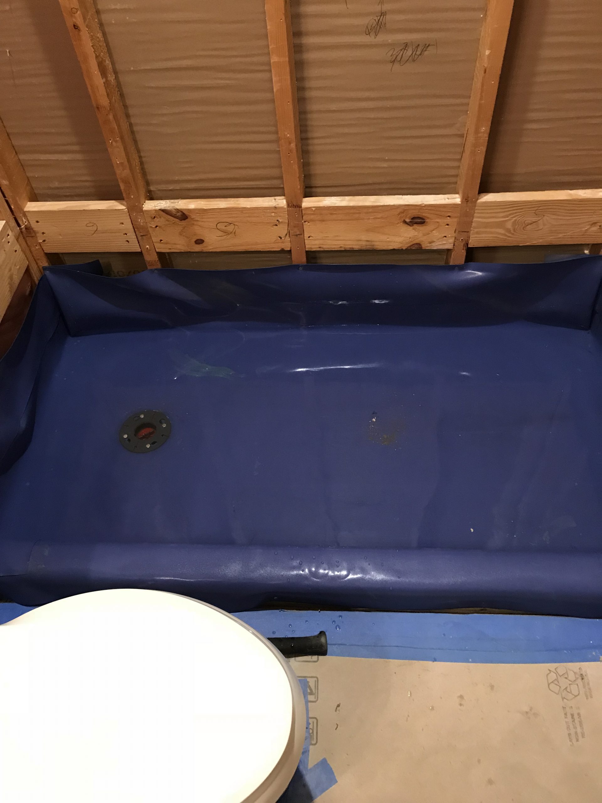 What we refer to as the “shower pan” includes several components. With a “masonry poured pan,” we build-up a supportive base and then encase it in a rubber liner that goes about 12″ or so up the framing of the walls and over the curb studs and any shaving ledge or bench. The most important step at this stage is to perform a shower pan test before moving forward with the remaining build-out. We’ll stop up the drain and fill the pan liner with water overnight to check to be sure that the water line hasn’t gone down. Once we’re sure the pan is sound and doesn’t leak, we can carry on with the remaining build-out.