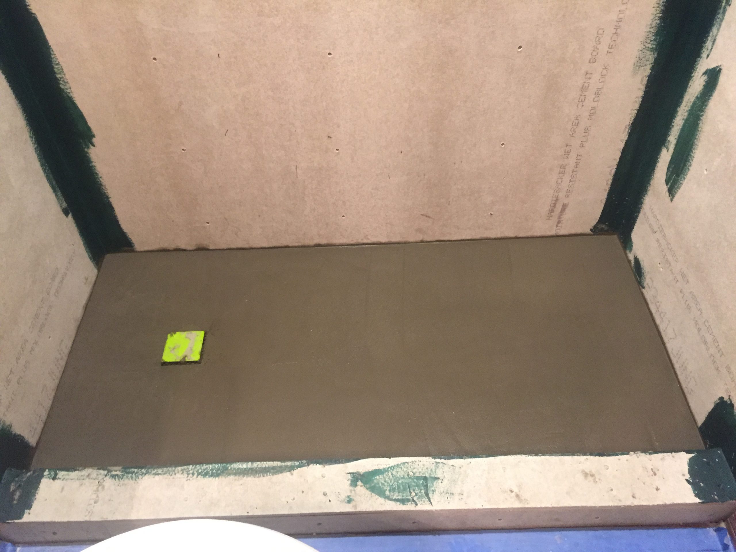 Where there are exposed studs, a 1/2″ concrete backer board is installed. Seams between backer panels are taped together and a waterproofing product is applied, and the final slope is added to the shower floor to insure proper drainage toward the drain. Then we’re ready for tile!